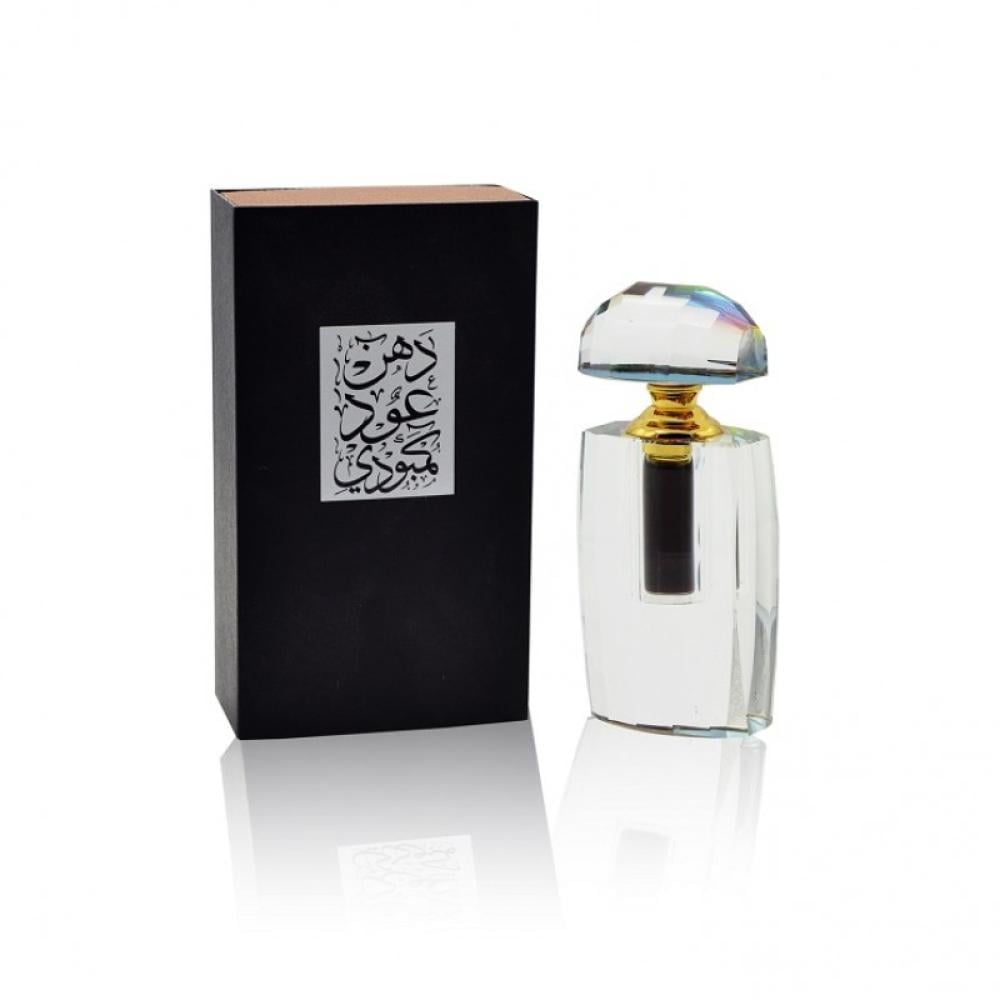 Authentic Cambodian oud oil in a polished crystal bottle, reflecting the transparency of its drops, to take you on a journey through the years.