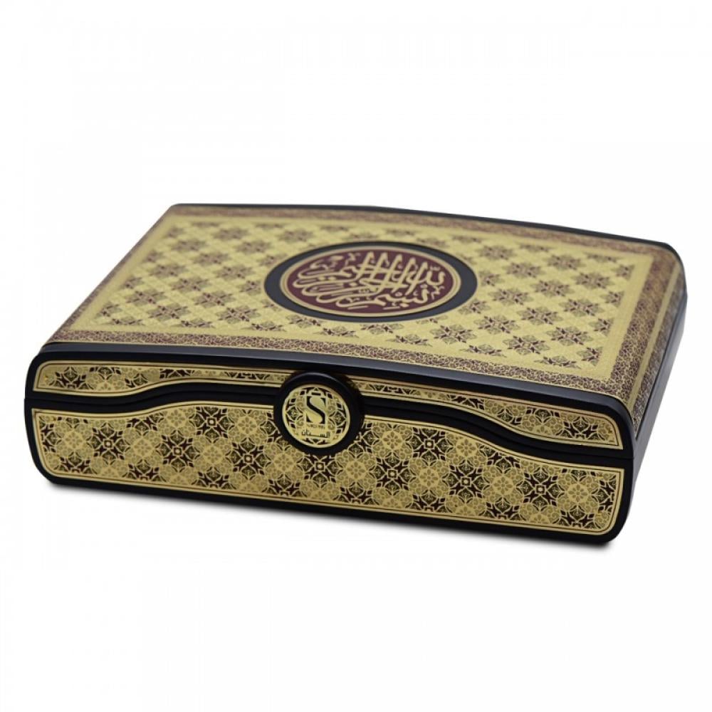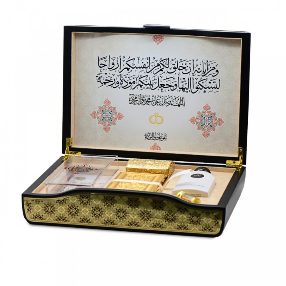 A luxurious box decorated with authentic hand-embellishments. It contains Masar Classic White perfume, an empty crystal oud container, a gilded metal box for the oud wood, and a gilded Qur'an. It also contains a gilded Qur'an.